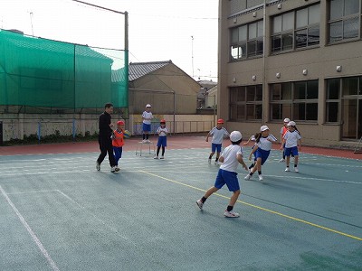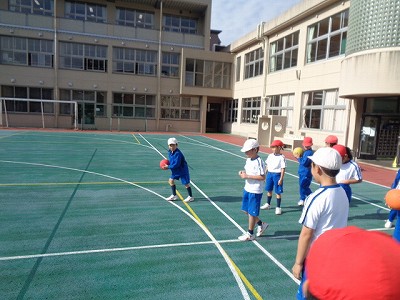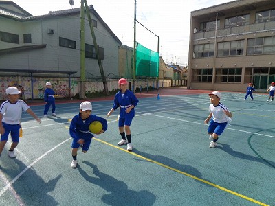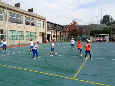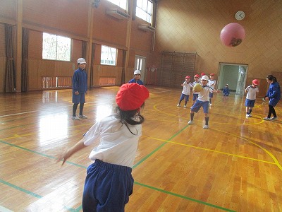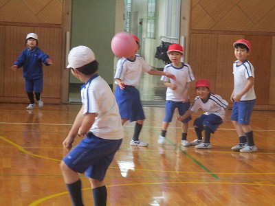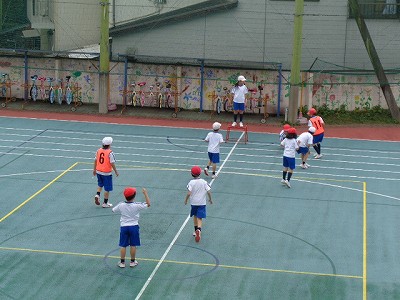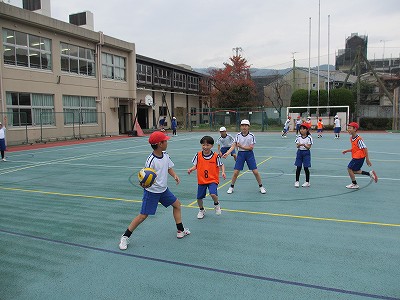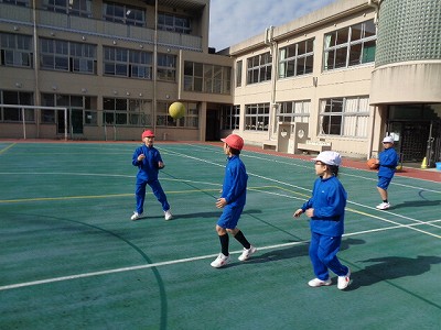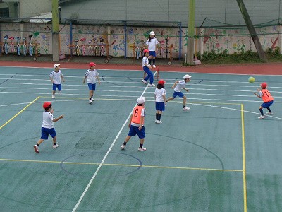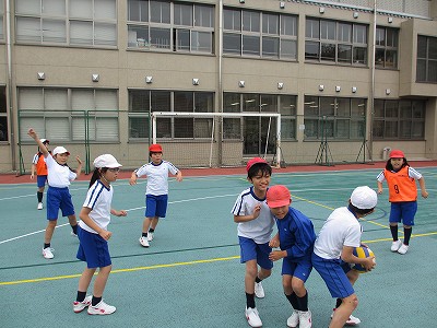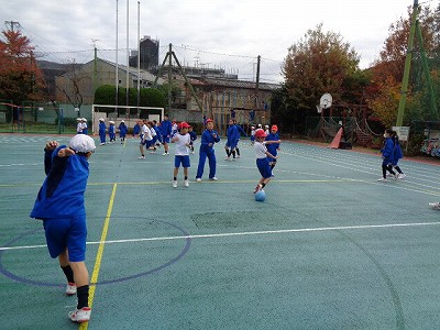 体育・ポートボール練習では、チーム対戦ですから、勝つために一生懸命になっています。