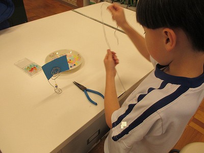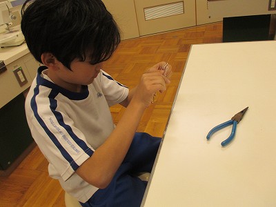 まず、カードを上手く挟むフォトスタンドを作るため、どんな形に作ればよいか見本を見ながら考えます。ペンチの使い方も確認しました。