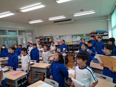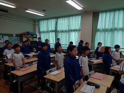 今日は、3週間ぶりの「朝マラソン」を行いました。雨や行事練習等でなかなか実施出来なかったのです。前回の朝マラソンでは、汗だくになりながら走っていましたが、さすがにこの気温では、そこまでにはなりません。それでも、走り終えた後、顔だけでなく、耳まで真っ赤になった子ども達の様子を見ると、思わず嬉しい笑みがこぼれます。