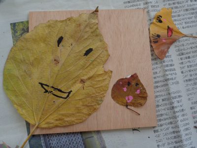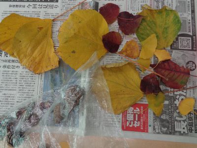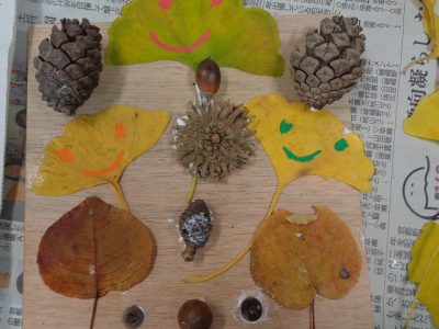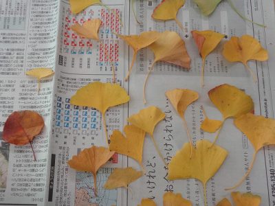 真っ黄色のイチョウの葉や細長い松ぼっくりを見つけ、知らせてくれました。