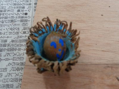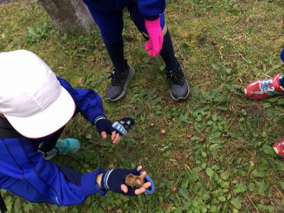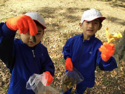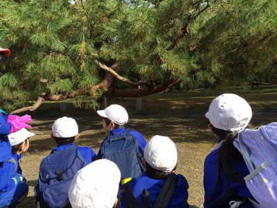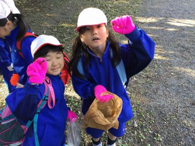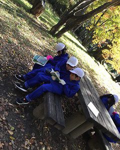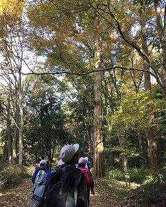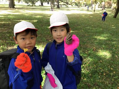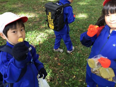 ここからは、学習院跡にある大銀杏の木を目指して、てくてく歩きます。途中で“クヌギ”のどんぐりが落ちているところを通りました。どんぐりは、少なかったのですが、“かさ”がたくさん落ちていたので、明日の造形遊びにと、2個3個いただくことにしました。