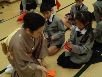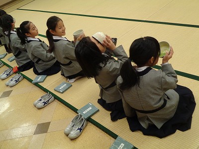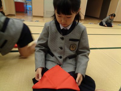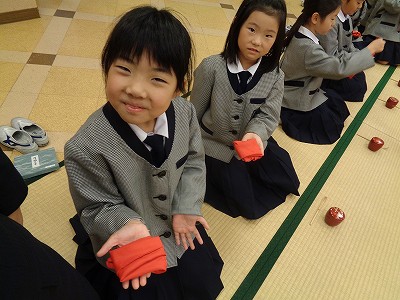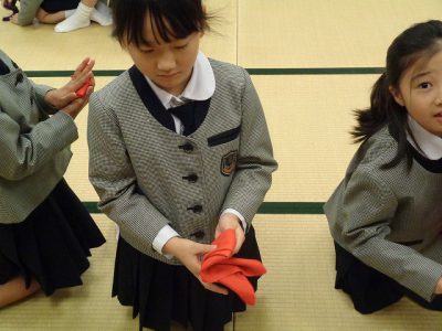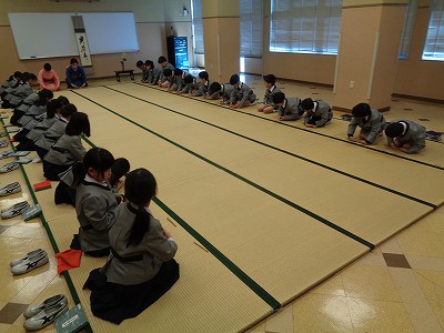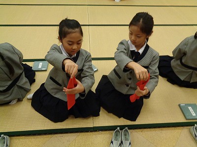 2校時、礼法の学習は、帛紗さばきの復習と練習をみっちり行いました。