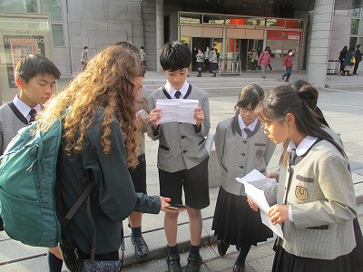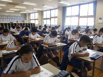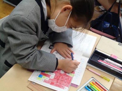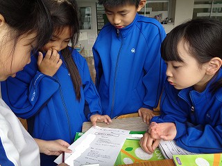 みんなで、"What's your phone numeber?"や、"May I borrow ...?のフレーズを確認して、文作りにチャレンジしていました。