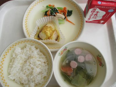 キャベツ、水菜、玉ねぎ、ウインナーの入った野菜たっぷりのスープでした。玉ねぎからよくうまみが出たスープになり、水菜のシャキシャキ食感も感じてもらえるスープになったと思います。