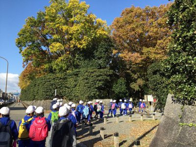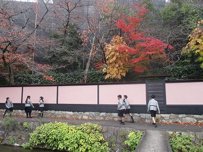 さあ、いよいよ御所とお別れです。紅葉したもみじを横に、学校へ向かいます。