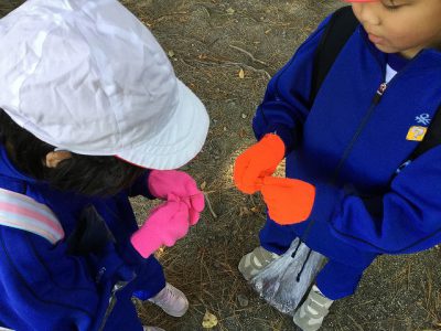 大きな切り株の上も楽しそうです。その根元には、キノコが自生しており、興味津々の子ども達。にぎやかな声が聞こえてくるようです。
