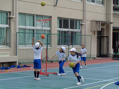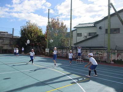ポートボール学習では、グループ毎にパスをつなぐ練習です。