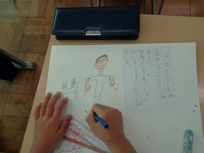 自分が作った俳句を発表する前に、ハッピの後ろに描いた絵を紹介しました。