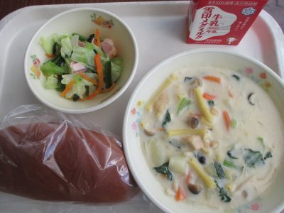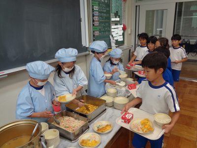 ここではロボ君が大活躍! でも、給食の場面では、プログラミングがうまくできていない設定で、ロボ君はカレーライスの上に、ヨーグルトもデザートも置いてしまいます・・・。