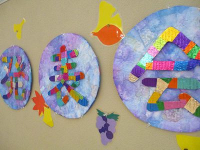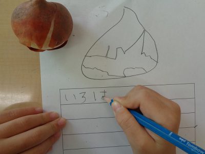 「栗みたい」「玉ねぎみたい」「桃みたい」「どんぐりみたい」など・・・形をよく見ながら、大きく描いています。