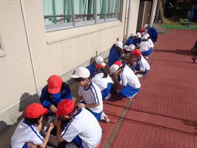 観察した後は、運動場に出て、チーム毎に球根を植えました。