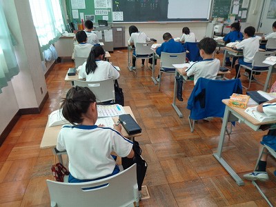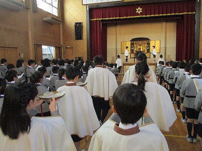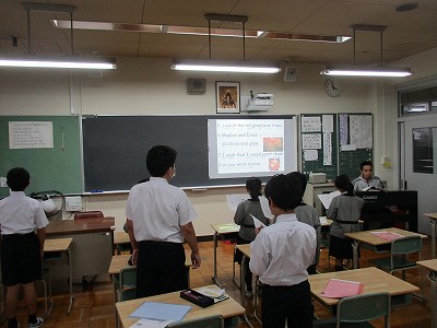 朝の礼拝後、1時間目は長谷川先生による「月かげ宗教」の授業でした。長谷川先生の凜とされた佇まいやお話しぶりに、見ているこちらの背筋も伸びます。子ども達も礼拝に続き、静かに落ち着いて授業に臨みました。