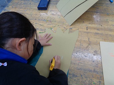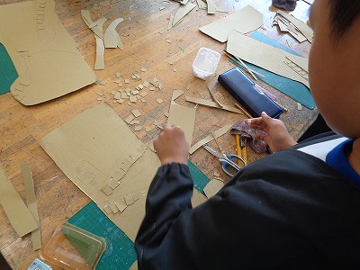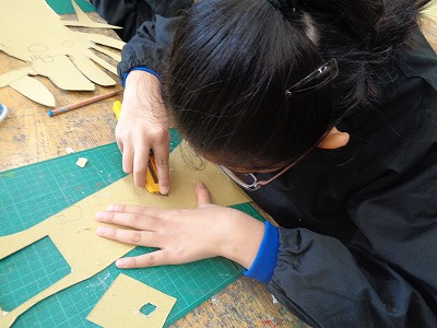 ボール紙の表面をカッターナイフで削って剥がしとり、木の質感を表現します。