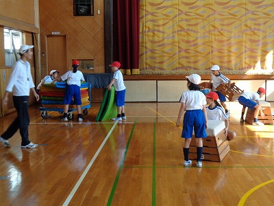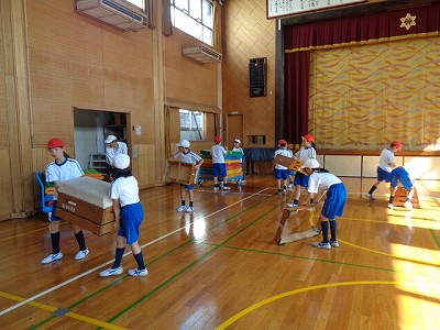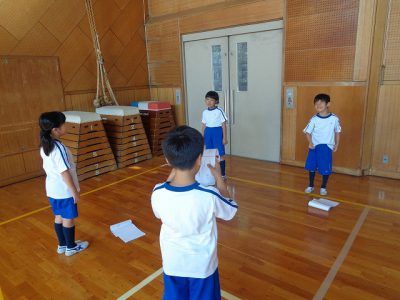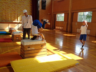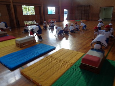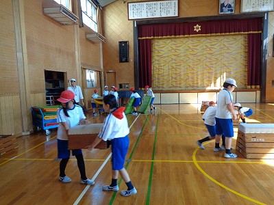 体育授業は、台上前転、開脚、閉脚跳びなどを行いました。準備、片付けも自分達でしっかりと。ここでも協力が大切です。