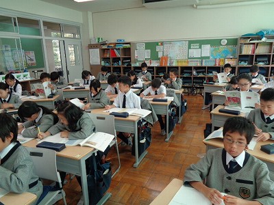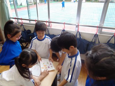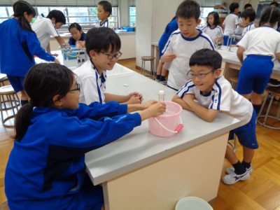 また、英語授業での読み聞かせや、理科授業での「ものの体積と温度」の学習実験でも夢中になって参加しました。実験でフラスコ内の空気を温め、詰めた栓が飛び出すのかどうか…。こわごわ、でも、興味津々でチームで実験を進めます。予想通りにいかなかった結果こそ、原因をつきつめて考えようとする態度を身につけてほしいのです。