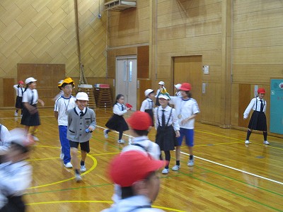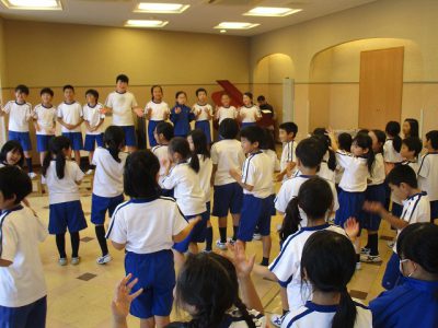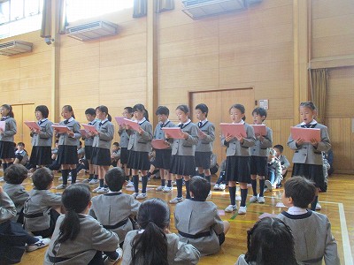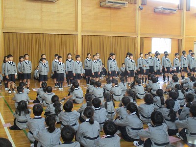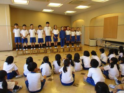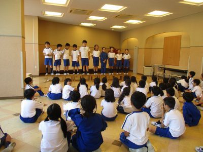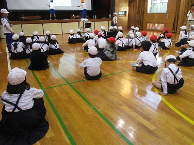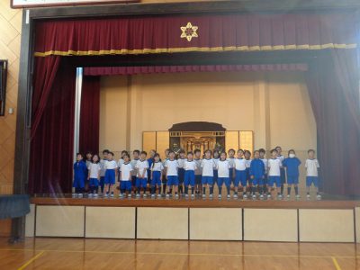 教室に戻って、手洗い、うがい、水分補給、マラソンカードの色ぬりを終えた後は、体育館で歌を歌いました。