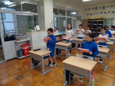 こういう日こそ、お腹から声を出して、気分を盛り上げていきたいところです。4年生は、いよいよ明日に音読発表を控え、今日の朝ねっこタイムは、少し空けた窓からグランドに向かって音読練習しました。