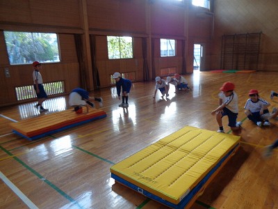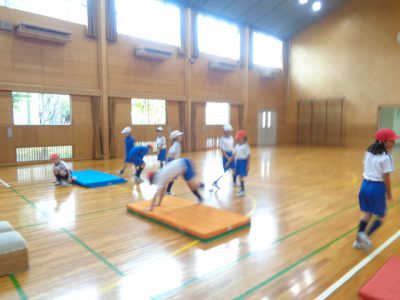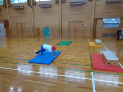 体育では、ウォーミングアップをした後、抱え込み跳びの練習として、かえるとびでマットを飛び越える練習から始めました。