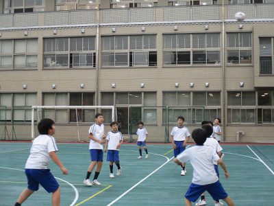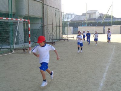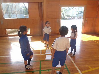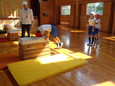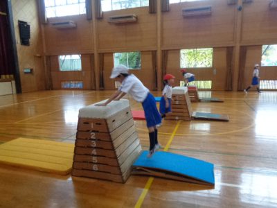 さらに、跳び箱一段をかえるとびで飛び越える練習と、ステップをふみながらの練習です。後半の開脚跳びは、今日で7段の高さになりました。それでも、軽々と飛び越える子もいて、自分のレベルに合わせて、それぞれのコースで練習をしています。