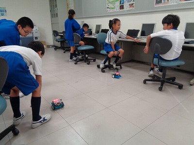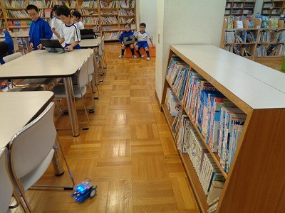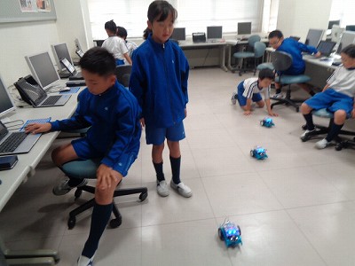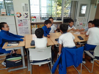 身近な物で、プログラミングによって動く物を調べるチーム、フローチャートを作成して、プログラミング的思考を発表するチーム、ロボットや音をプログラミングして発表するチームに分かれて、相談しました。