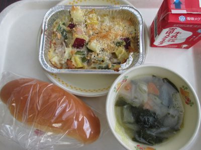 じゃがいも、さつまいも、玉ねぎ、三度豆、マッシュルームをバターで炒めて、小麦粉、生クリームと牛乳でホワイトソースを作りました。仕上げに、パン粉と粉チーズをふってやいてあります。いも類は、先にコンベクションオーブンで蒸すなど下準備をしっかりして作っています。