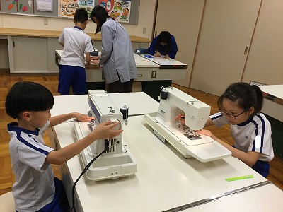 アイロンあてが済めば、ミシン縫いへ。前回からの台ふきん作りで、とっても得意になった4年生。6年生と向き合って、丁寧に縫い進めていました。