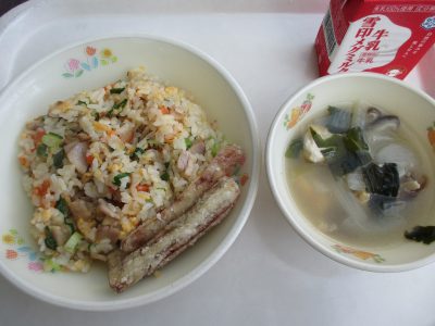 卵、ピーマン、人参、ねぎ、焼き豚と五種類の様々な具が入った「五目チャーハン」です。野菜をあらかじめ蒸して、素早く炒めて食感が良いように調理しています。味付けはシンプルですが、野菜や焼き豚の風味で、よりおいしさを感じることが出来ました。