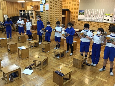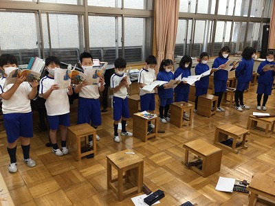 まずは、教科書P92の「カンジーはかせの音訓カルタ」の漢字の音と訓を使った、リズム良い詩を音読しました。
