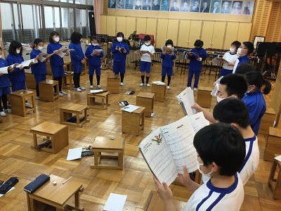「♪パフ」の歌唱を深める時間です。5番まである歌詞の言い回しが難しく、それぞれに注意ポイントが違っていて、歌い慣れるのに少し時間がかかります。
