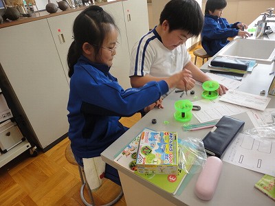 そして、一人一人が自由に磁石をさわりながら、発見したことをプリントに書き留めていきました。
