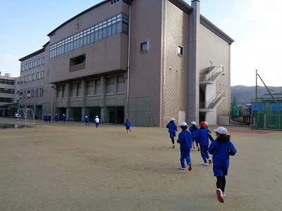 「朝根っこタイム」は、小雪のちらつく中でしたが、マラソンをしました。