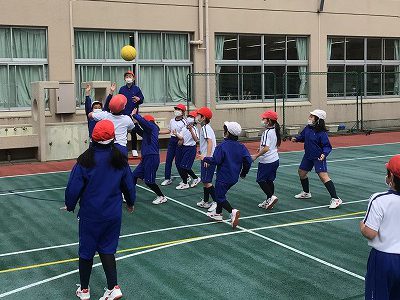 ポートボールの試合では、コートを大きくして2チームで対戦しました。