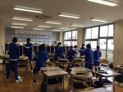 教室と音楽室に分かれて練習しています。こちらは、“タイヤ”を使って練習中の「嵐山太鼓」チームです。「序・破・急」の三部構成のリズムを体で覚えようと、タイヤに向かっています。