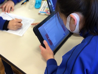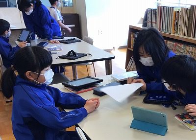 次は図書室に移動し、広い机を使ってチーム活動を行います。現在、4年生では生活に関するアンケートをとって、みんなで発表を行う学習をしています。