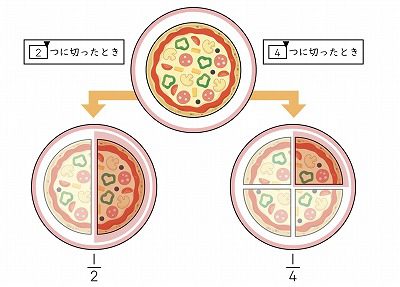 二分の一のピザを食べるには、2つに分けて1つ分食べる方法(二分の一)と、4つに分けて2つ分食べる方法(四分の二)があります。