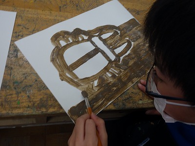 「先生、これがほんとに絵の具になるんですかぁ。」「土が絵の具って・・・。」