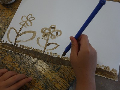 画用紙に向かうと恐竜や魚、地面にモグラや草花など、「土」から想像したものを描く児童もいました。