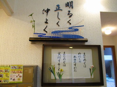 玄関の壁に、学校のめあて「明るく 正しく 仲良く」が刻んであります。