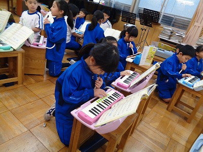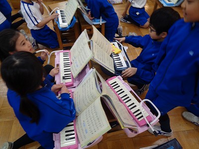 音楽室に入ると、2年生は鍵盤ハーモニカと格闘中。