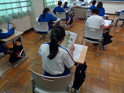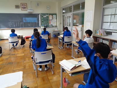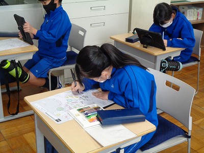 社会では、京都府の紹介マップ作りの続きを行いました。1年間学んできた京都の学習を思い出し、思い思いの知識を白地図にまとめていきます。タブレットでの調べ学習も順調です。授業では習っていない市のことも追加で調べ、記入している4年生がたくさんいました。