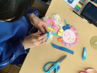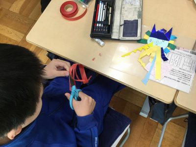 紙テープを細く切り込みを入れる友達や、レースのリボンにも色づけを施す姿に、周りの子達も刺激を受けて、細やかな工夫を取り入れています。