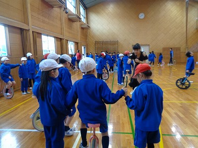 あまり一輪車に馴染みのない児童も、友達と一緒に練習して、コツをつかんでいました。