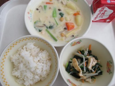 ほうれん草、人参、もやし、油揚げのソテーです。油揚げには下味をつけるため、あらかじめ炊いておきました。野菜は先に火を通して、野菜の良い食感が残るようにしています。シチューにも同じ青菜が入っていますが、この青菜は小松菜です。小松菜もシチューが出来上がった最後に加えて、シャキシャキが残るようにしました。