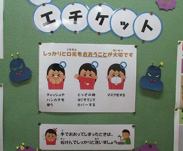 保健室の掲示でも、手洗いの方法に加えて「咳エチケット」について掲示しています。