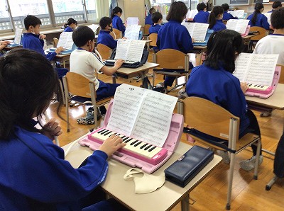 教室に戻り、鍵ハモと格闘!?です。あまり長い時間の練習はできません。効率よくポイントを決めて全体練習も行いました。