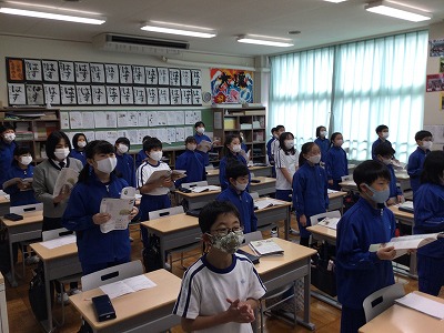朝根っこタイムには、音読を行います。4年生では、6年生ありがとうの会で音読を発表をすることに決まりました。