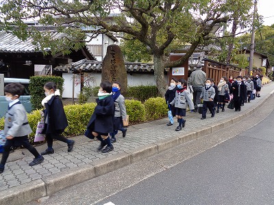 今朝は、法然様ご命日のお参りと、この一年間の自分のがんばりや、目標の実践状況をご報告するため、全校で浄土宗総本山知恩院へ向かいました。日頃、登下校の時や教室から見えている子ども達にお馴染みのお寺です。