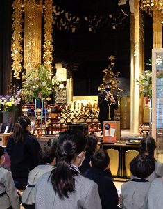 本来、知恩院での法要は、仏教聖歌を8曲歌ったり、「四誓偈」というお経を読みます。今回は感染症対策のために声を出して歌うことなく、録音された仏教聖歌3曲を静かに聞きました。