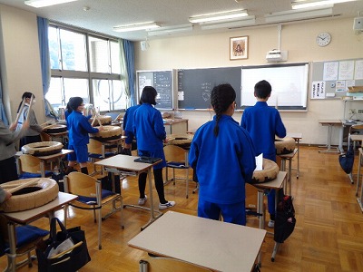 音楽室では、太鼓を使って練習する「嵐山太鼓」の様子です。