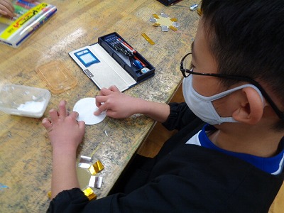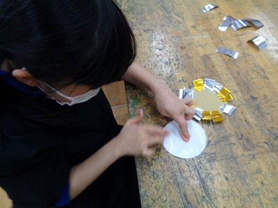 台紙となる丸い厚紙に、キラキラの飾りを付けるところからスタートです。
